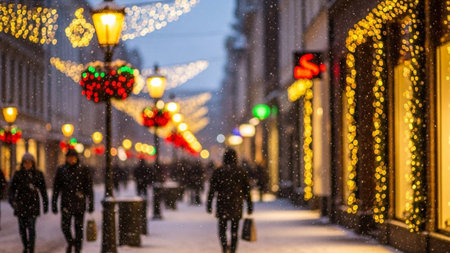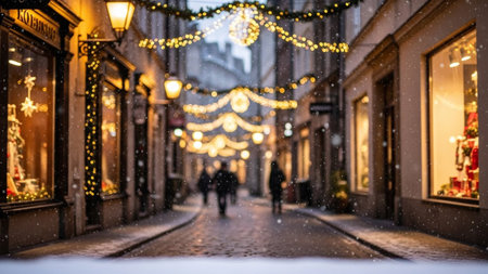 A charming European street at dusk, adorned with festive Christmas lights and falling snow, with blurred figures...
