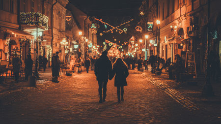 A couple walks hand in hand down a charming cobblestone street at night, surrounded by festive lights and decorations that create a romantic atmosphere.