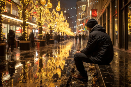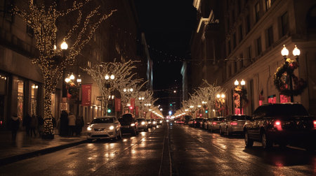 An AI generated illustration of a festive scene of a city street illuminated with Christmas lights