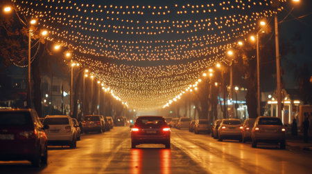 Cars navigate a charming street adorned with twinkling lights as dusk falls. The warm glow of decorations creates a cozy atmosphere for evening strolls.