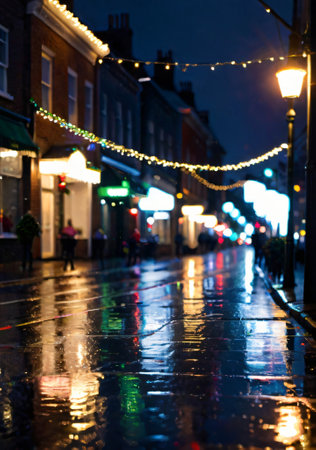 Weather showing wet city street at night illuminated by festive christmas lights reflecting on the wet pavement...