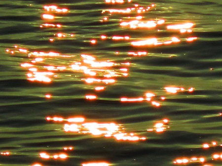 A close-up shot of shimmering golden light reflecting on the surface of the water as the sun sets.