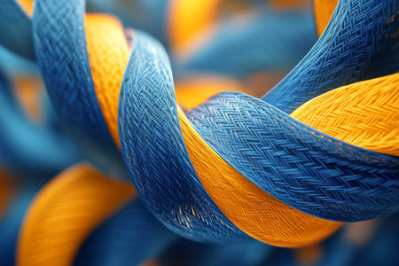 Close-up view of vibrant blue and yellow fibers twisted together, showing intricate patterns and textures with a dynamic flow. The colors create an eye-catching visual effect.