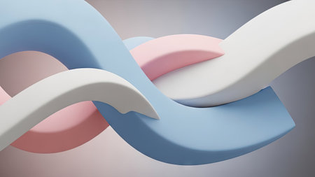 Smooth, intertwined ribbons of blue and orange create a fluid, abstract shape with soft gradient blending and gentle...