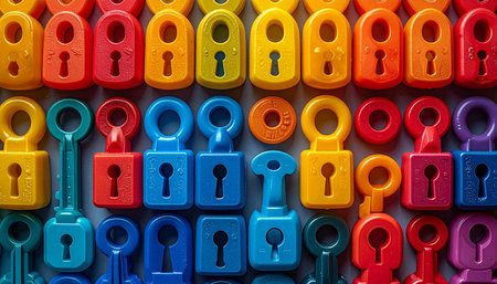 A vibrant collection of colorful toy locks arranged in neat rows, creating a visually striking pattern.