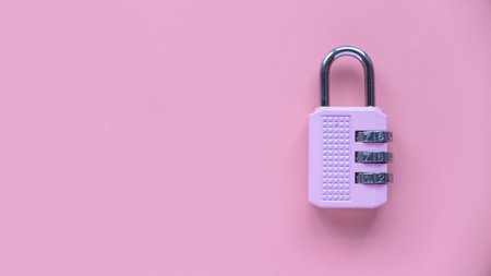 Safety and protection concept. Pink padlock isolated on a pink background with copy space.