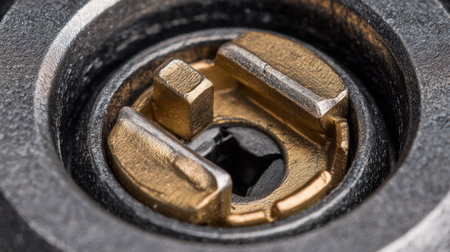 A detailed close-up image of a metal mechanism, highlighting intricate craftsmanship and design with golden and silver tones, perfect for technology and engineering themes.