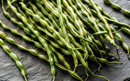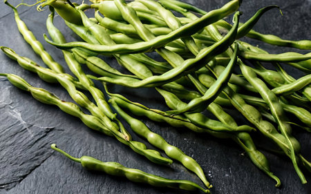 Green beans on a black slate board. Dark rustic background.