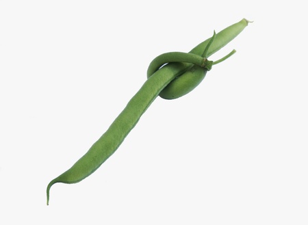 an odd green bean against a white background