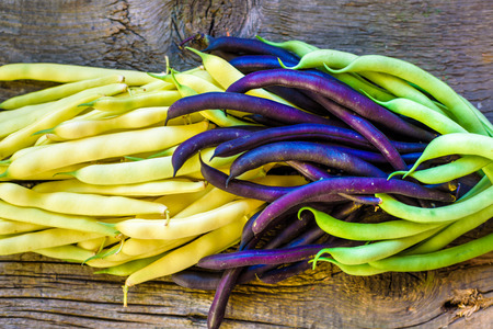 Collection of green, yellow and purple bush beans, opened green peas on wooden rustic background.