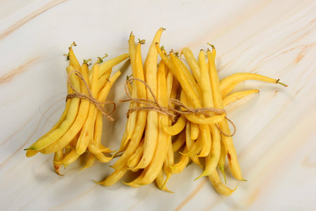 Raw Organic Yellow String Beans in a bunch on white background. Organic yellow wax bean on a table. Freshly harvested vegetables, organic food concept