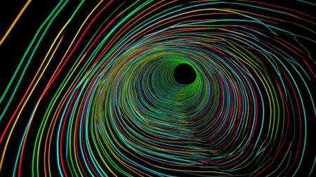 An abstract visualization of a tunnel effect created by swirling, colorful light trails. The lines of light twist and turn, creating a sense of rapid motion and the viewer towards a dark central...