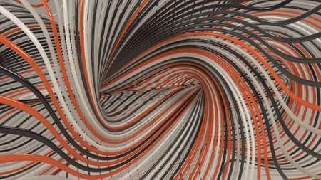 Abstract black, white, and orange lines creating a dynamic twisted flow