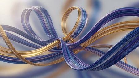 Intertwined metallic ribbons in brushed gold and silver create an infinity loop shape with subtle textural details...