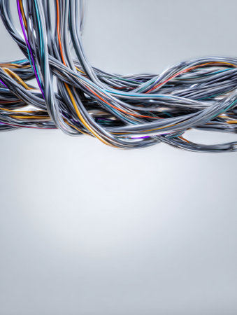 Cables tangled together are gradually arranged into a neat formation, symbolizing clarity and efficiency in technology amidst an empty, minimal background.