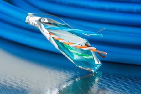 Stripped UTP cable with a tip on a light blue background. Materials for connecting an network.