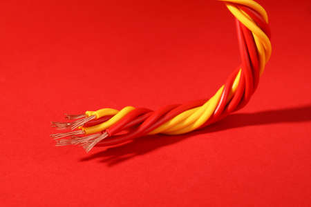 Electrical wires on red background, closeup view