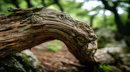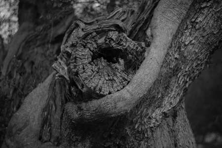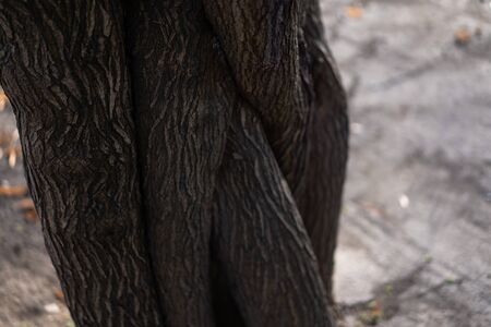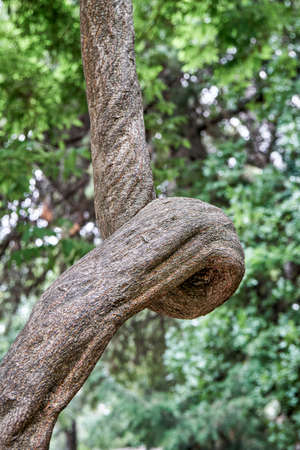 Close-up of the clumsy cracked and twisted tree trunk. Weird tree branch form against a blurred background.