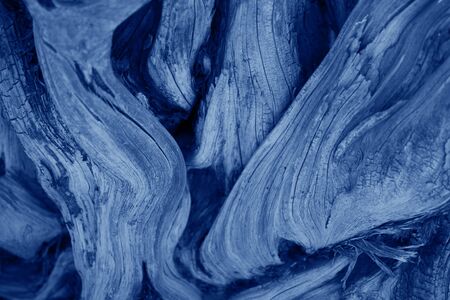 Blue wooden texture, driftwood. Old withered tree, migratory branches. Trend color 2020 classic, top view. Trendy color concept of the year, classic blue wooden background.