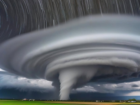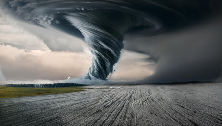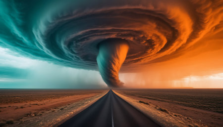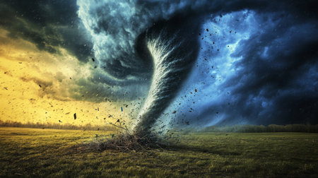 An awe-inspiring tornado spirals down from dark storm clouds, creating a dramatic scene over a rural landscape. The contrasting colors highlight nature's power.