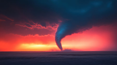A striking tornado develops over the ocean during sunset, showcasing vibrant colors and dramatic cloud formations. This captivating weather event highlights nature's power and beauty.