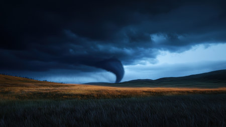 A powerful tornado descends from dark storm clouds over a grassy field. The scene presents a dynamic composition with swirling air and a turbulent sky. The color palette consists of cool tones and natural textures, creating a sense of impending danger. This imagery could be used for various commercial or editorial projects.