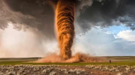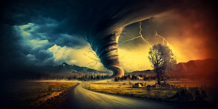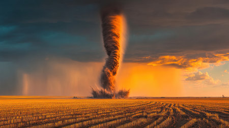 A powerful tornado descends from dark clouds, swirling with intensity amidst a tranquil rural field. The setting sun casts a warm glow, enhancing the dramatic atmosphere. Generative AI.