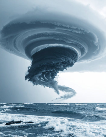 A colossal waterspout, a powerful vortex of wind and water, descends from dark, swirling storm clouds to touch the surface of a turbulent ocean. This awe-inspiring and terrifying display of natures raw power captures a moment of extreme weather, symbolizing immense force, chaos, and the dramatic impact of climate phenomena.