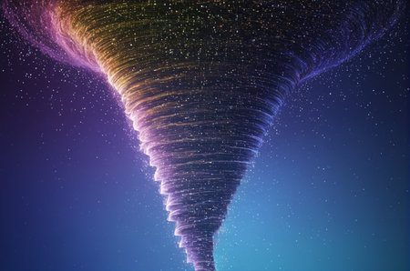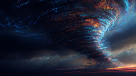 Swirling digital vortex, glowing blue and orange lights, dramatic sky, futuristic energy, dynamic movement, night atmosphere