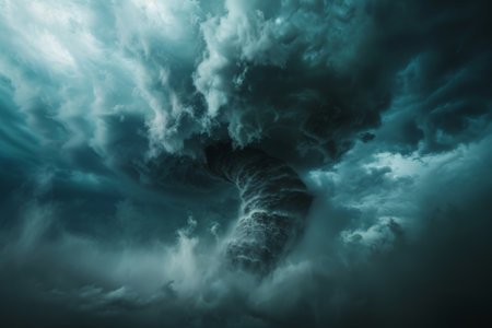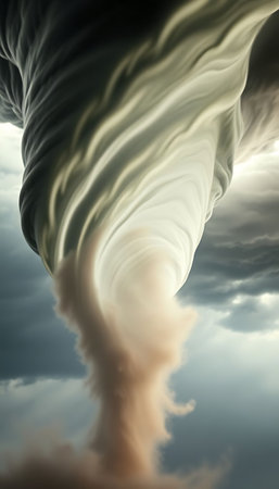 A dramatic low-angle view captures the immense and terrifying power of a supercell tornado. The turbulent vortex of the funnel cloud churns the sky, creating a scene of both awesome natural beauty and imminent destruction, perfect for illustrating themes of chaos, climate change, and overwhelming force.