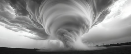 A stylized tornado funnel forms over a smoky prairie, rendered in grayscale tones against a cloudy backdrop. This intense image is ideal for science-themed or dramatic visuals.