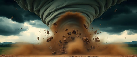 A dramatic image of a tornado in action, showing swirling winds and debris. Perfect for themes of natural disasters, extreme weather, and environmental forces.