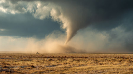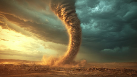 An intense tornado looms over a desolate landscape, creating a striking contrast against dark storm clouds, illustrating the awe-inspiring power and unpredictability of nature.