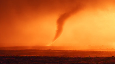 Powerful tornado sweeps through a fiery landscape, creating a breathtaking and terrifying scene of nature's fury, marked by dark storm clouds and swirling winds.