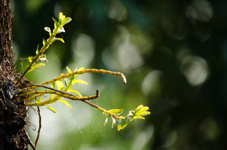 Close up transparency small yellow orchid flowers and white bokeh on brown and green background