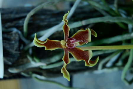 Detail of an exotic and tropical orchid flower that has hard petals of yellow color and circular center in the shape of a bulb, with brown spots (stripes) in the shape of a tiger
