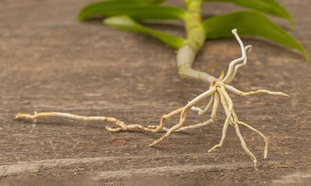 Orchid roots dendrobium nobile on a wooden background.