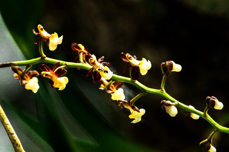 Wild miniature orchids with yellow flowers are blooming.