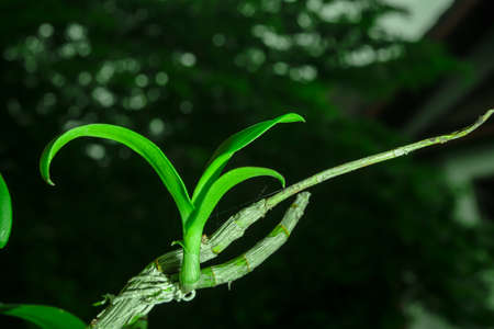 A dying branch of an orchid has given birth to a new branch to replace the old one.