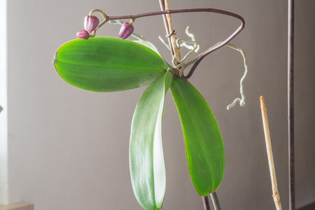 Orchid flower spike by the window under artificial light in winter, Phalaenopsis flower buds closeup