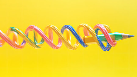 A vibrant image featuring a colorful pencil intertwined with twisted wire against a bright yellow background, perfect for creative and educational themes.