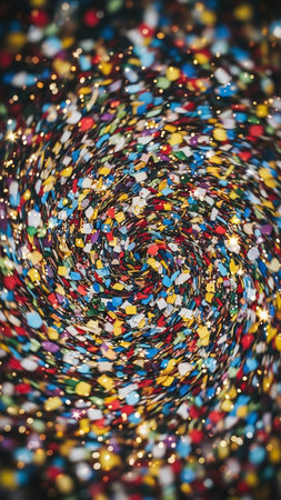 A vibrant swirling vortex of colorful confetti and blurred bokeh lights creates a dynamic and energetic abstract pattern with intense, vivid hues.