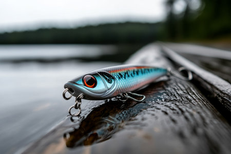 A fishing lure rests on the weathered planks of a wooden dock, its hooks ready for action.