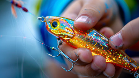 Colorful Fishing Lure Held in Hands by a Person Preparing for a Fishing Trip Near a Serene Lake Setting During a Sunny Day. Generative AI