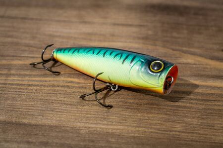 Wobbler perch or pike bait. Fishing bait tackle and baubles for fishing on a wood background.