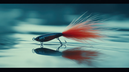 This captivating image showcases a vibrant fishing lure with a striking red tail, perfectly mirrored in calm water. The simplicity and detail highlight its design and craftsmanship.
