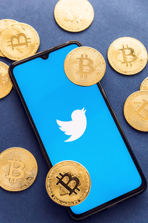 Valencia, Spain - October, 2021: smartphone with Twitter application surrounded by bitcoins.Twitter enables the sending of tips in Bitcoin to other users
