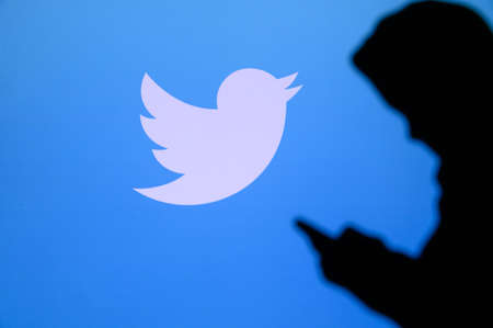 Tashkent, Uzbekistan - March 4, 2021: Silhouette of people over popular microblogging and social networking service - Twitter logologotype on a large screen