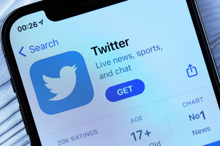 Sankt-Petersburg, Russia, April 6, 2018: Twitter application icon on Apple iPhone X smartphone screen close-up. Twitter app icon. Social media icon. Social network