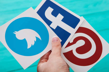 KIEV, UKRAINE - MARCH 10, 2017. Facebook , Pinterest, Twitter logos printed on paper in woman hand on blue wooden background. selective focus